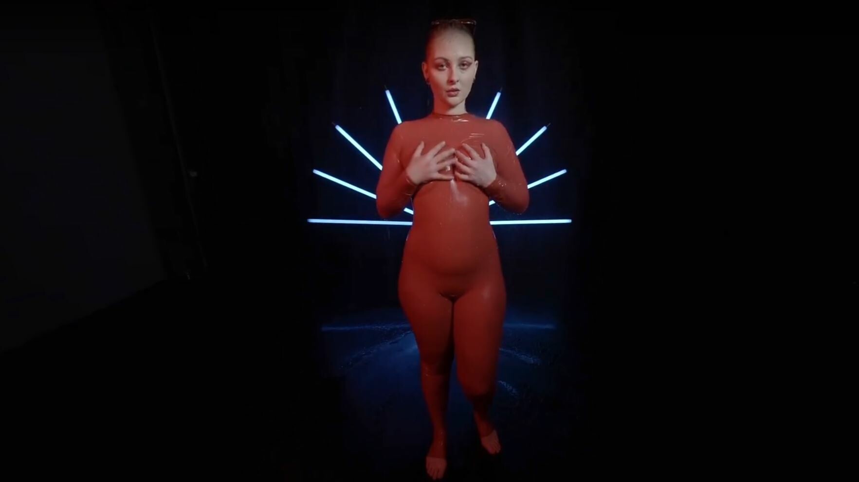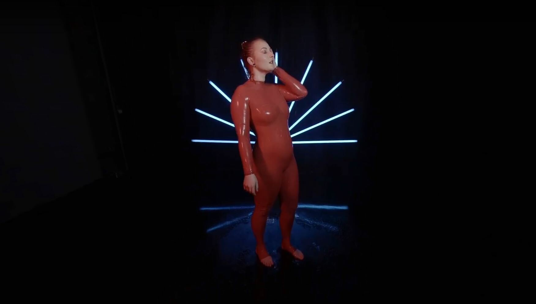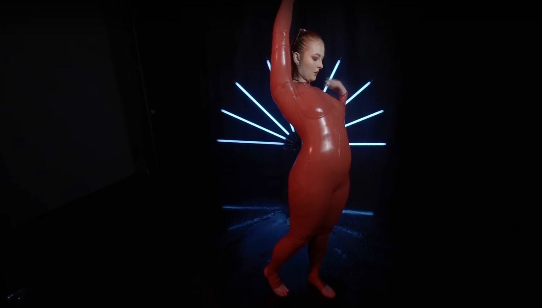 Red Latex Lady Takes A Shower