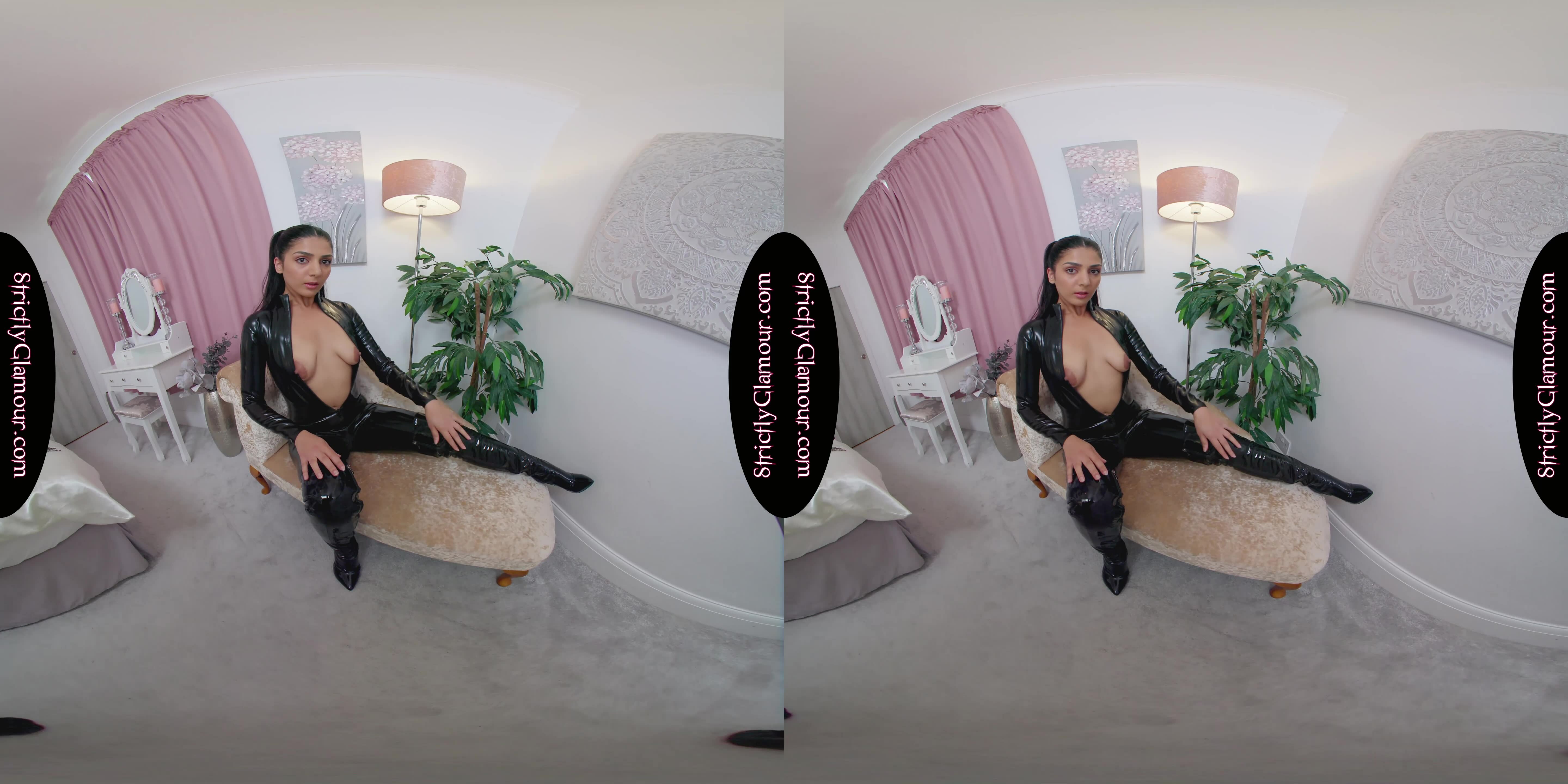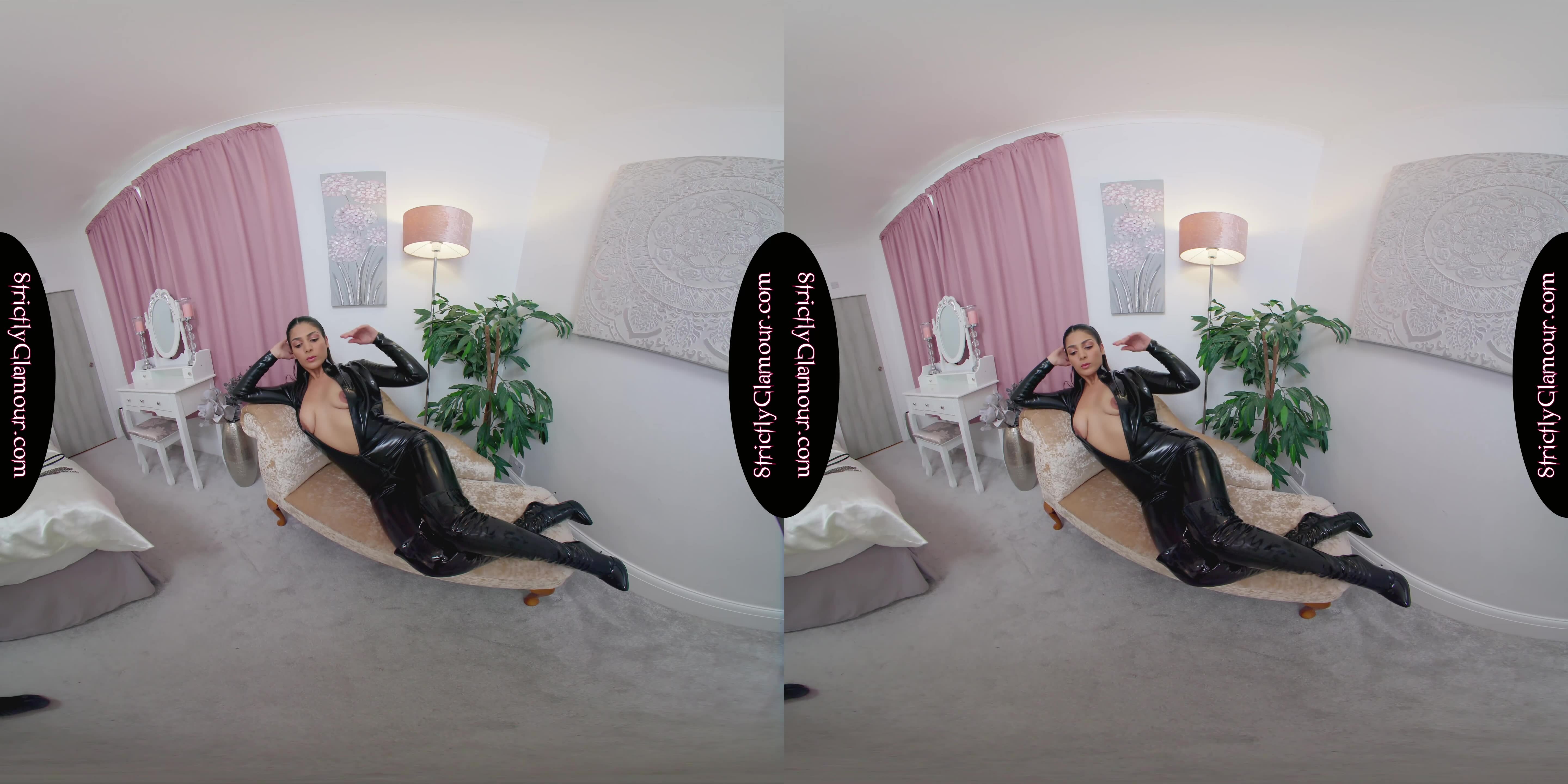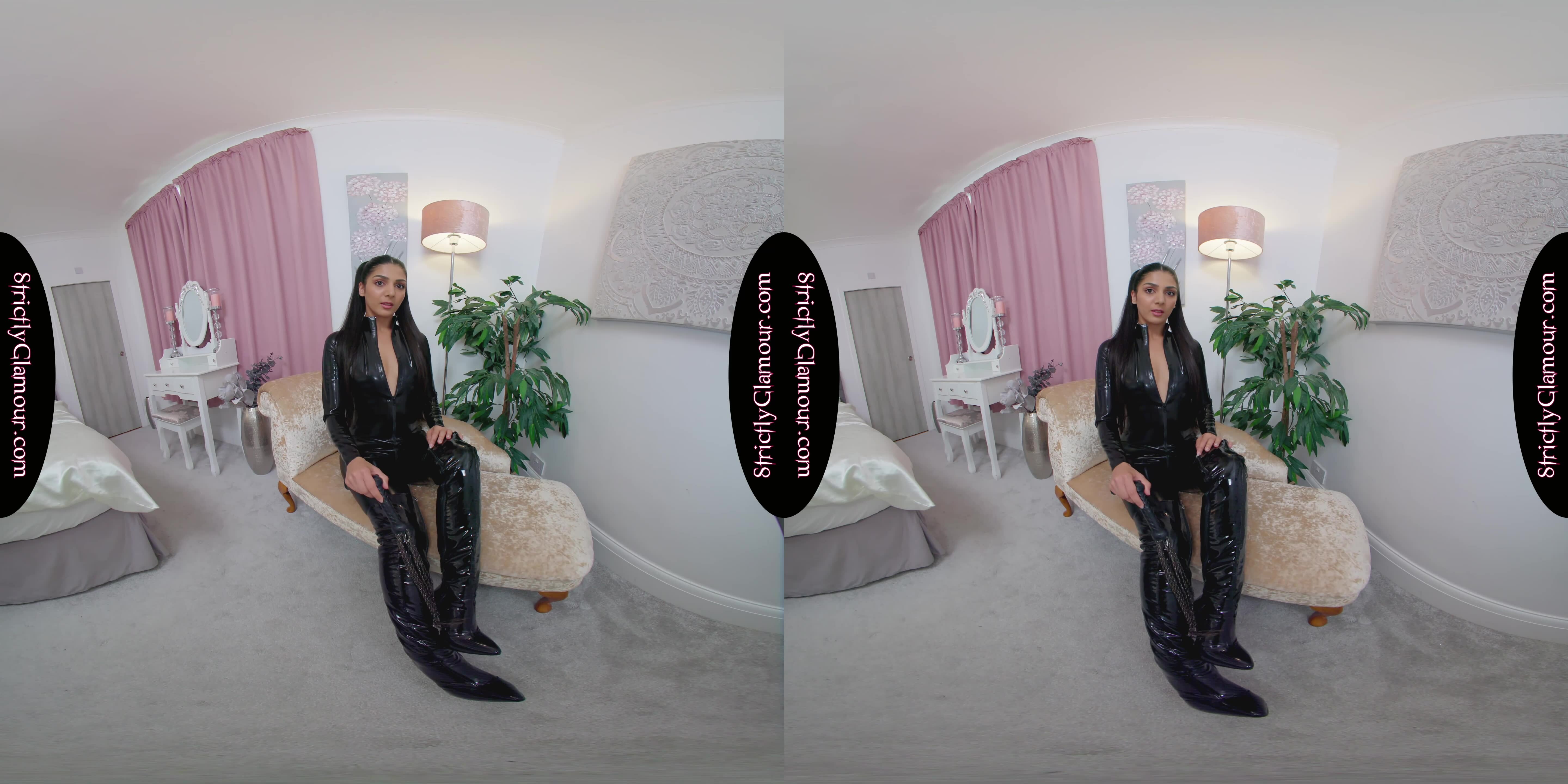 8K 60fps VR Video from shoot with Jasmine wearing a black latex catsuit (sans bra), black stiletto heeled OTK boots, steps forward with flogger whip in hand to entertain and tease in a powerful performance to topless. Listen carefully to what she has to say and enjoy!