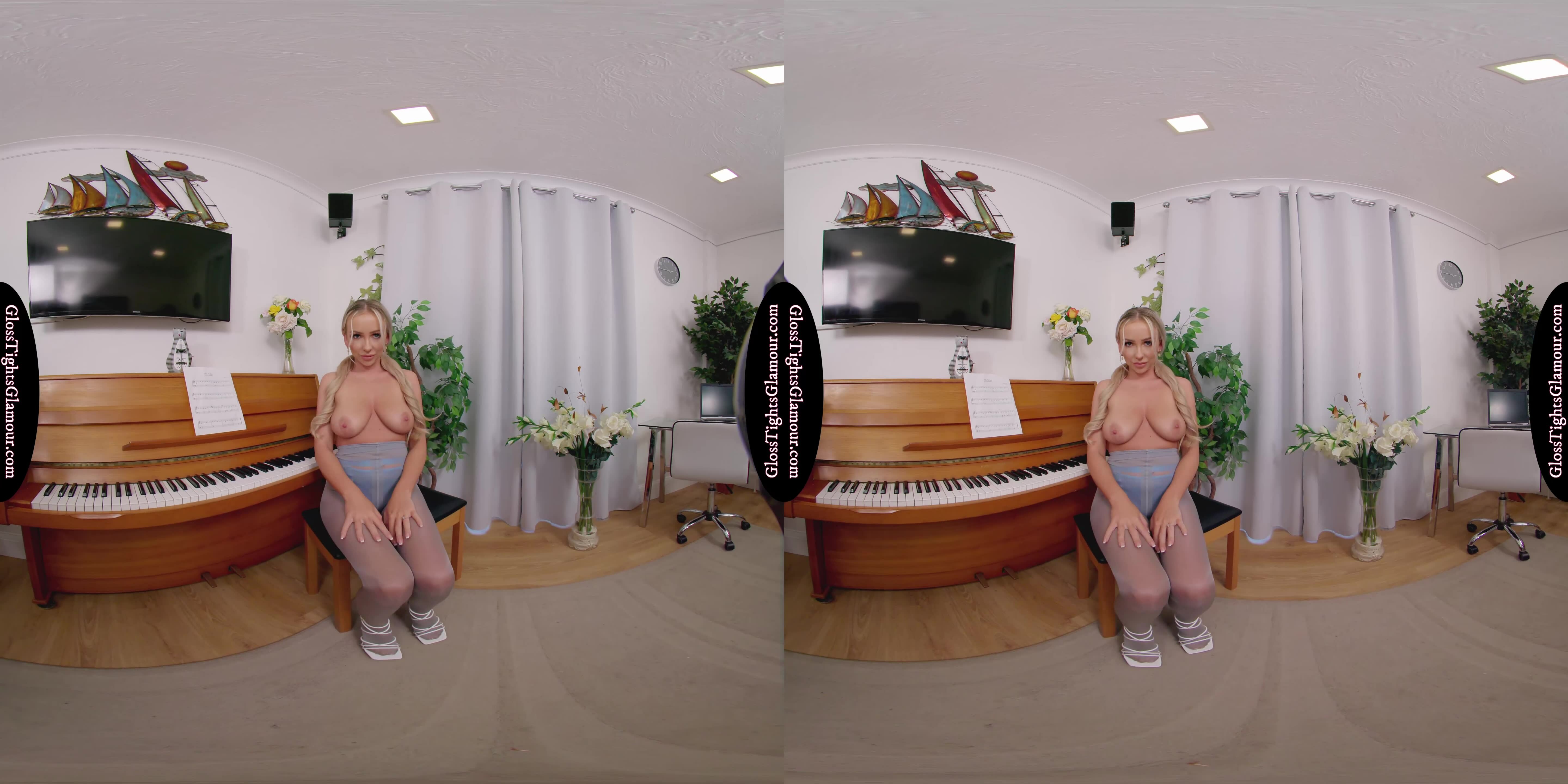 Bethany Morgan is a sight to behold in this 8K VR masterpiece! She's wearing a stunning pink silk blouse, complimented by her patterned skirt, blue matching bra and briefs/panties lingerie set, grey glossy tights/pantyhose, and white block heeled strappy shoes that are removed to show off her toes/feet. As she teases us with a topless performance, you can't help but be mesmerized by her beauty and charm.