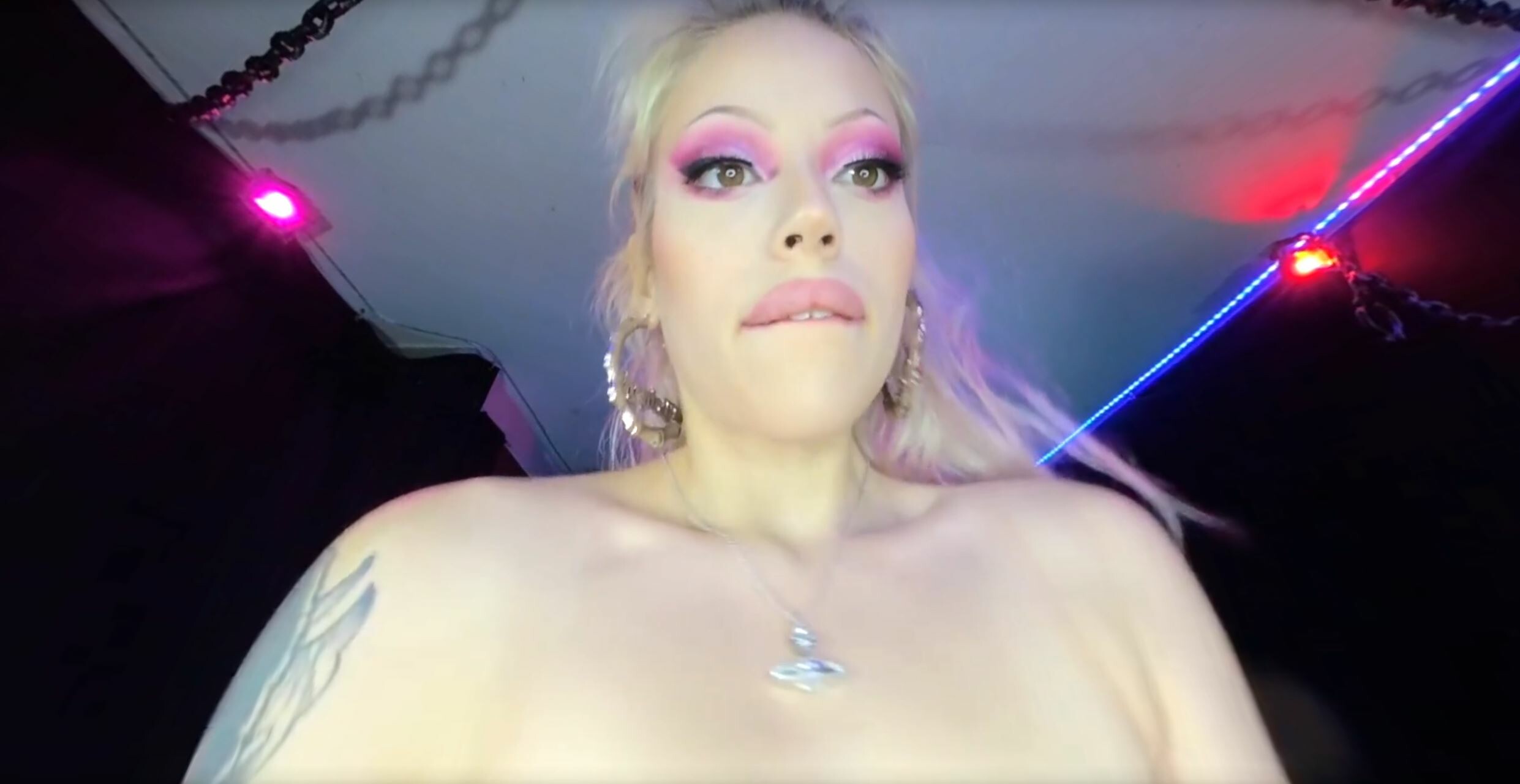 The scene is set for a sultry performance as Angel Rae Doll strips down to her bikini, flaunting her toned physique. Her tattooed body glistens under the lights as she performs a series of intense positions, leaving you breathless and wanting more.
