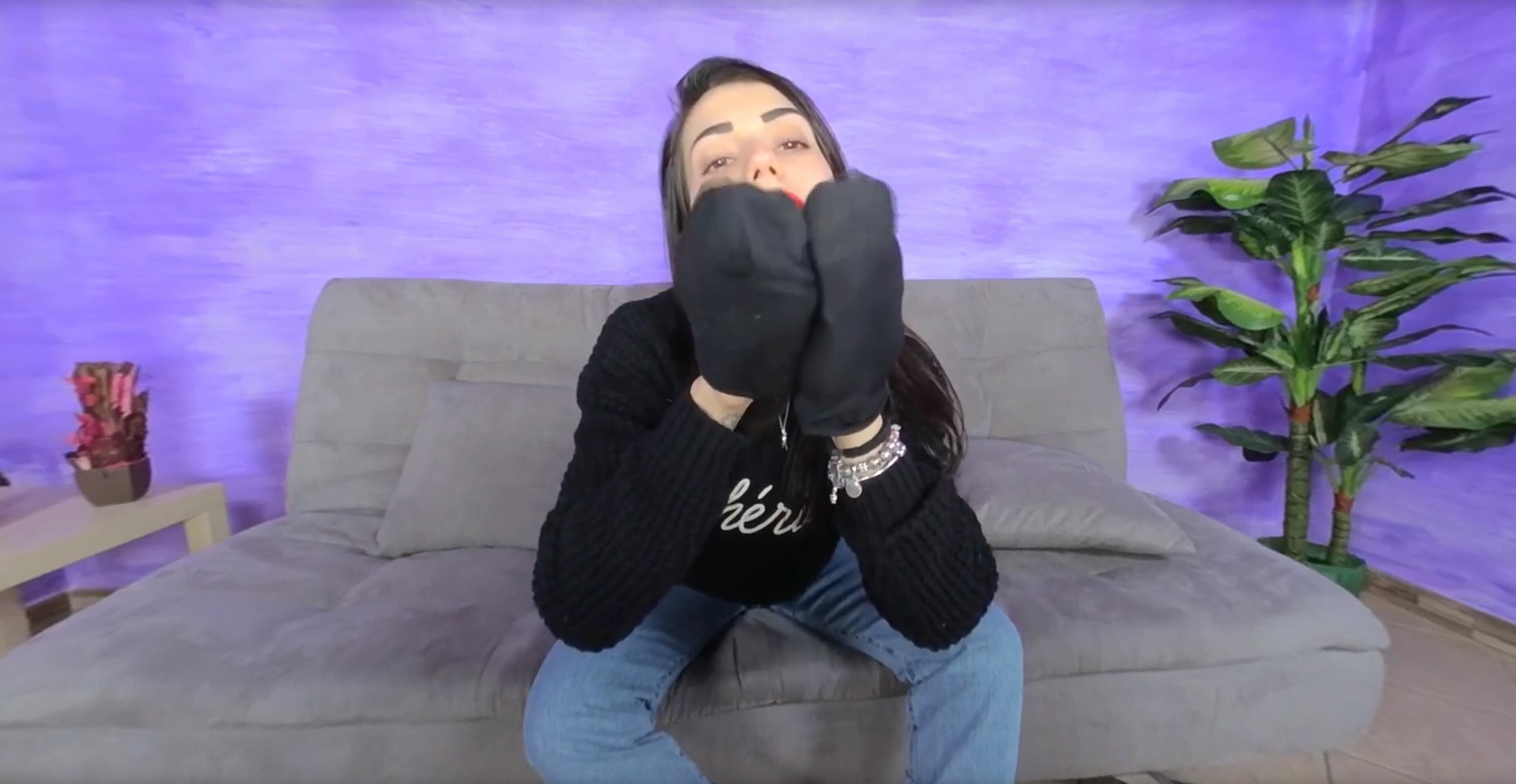 Smoking-hot Petra is talking on the phone with a friend about her daily workout routine. She radiates sex appeal even without showing much skin, and looks stunning in a classic black jumper paired with light-wash jeans. Her fabulous feet are clad in a pair of black and white chunky trainers. The big-lipped brunette takes off her smelly shoes, sniffs them and seductively flaunts her sweaty feet clad in ankle-high black socks. She finally takes off her socks and exhibits her bare feet.