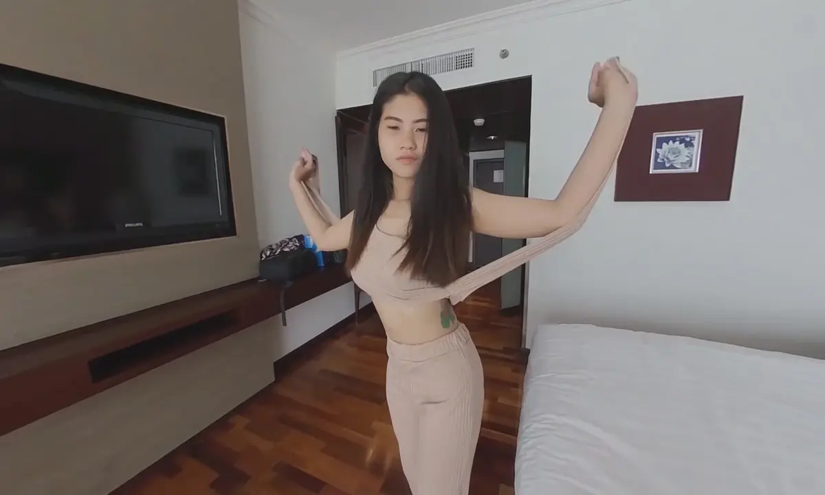 You find this amazing 18yo bargirl named Mild in Bangkok and you take her to your room. She wears a sexy pink outfit and starts to dance on the music before kneeling for your hard dick. You are ready...