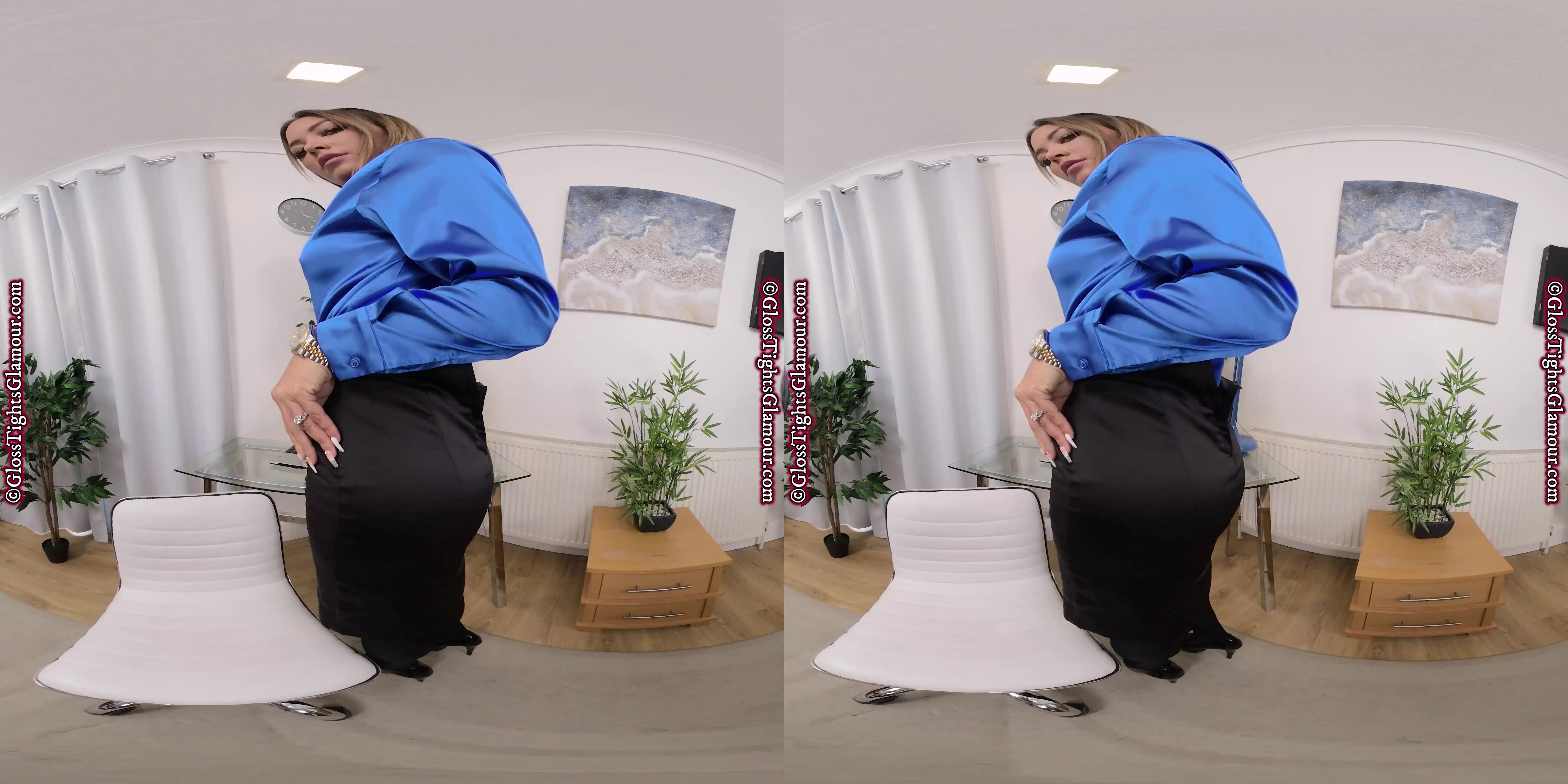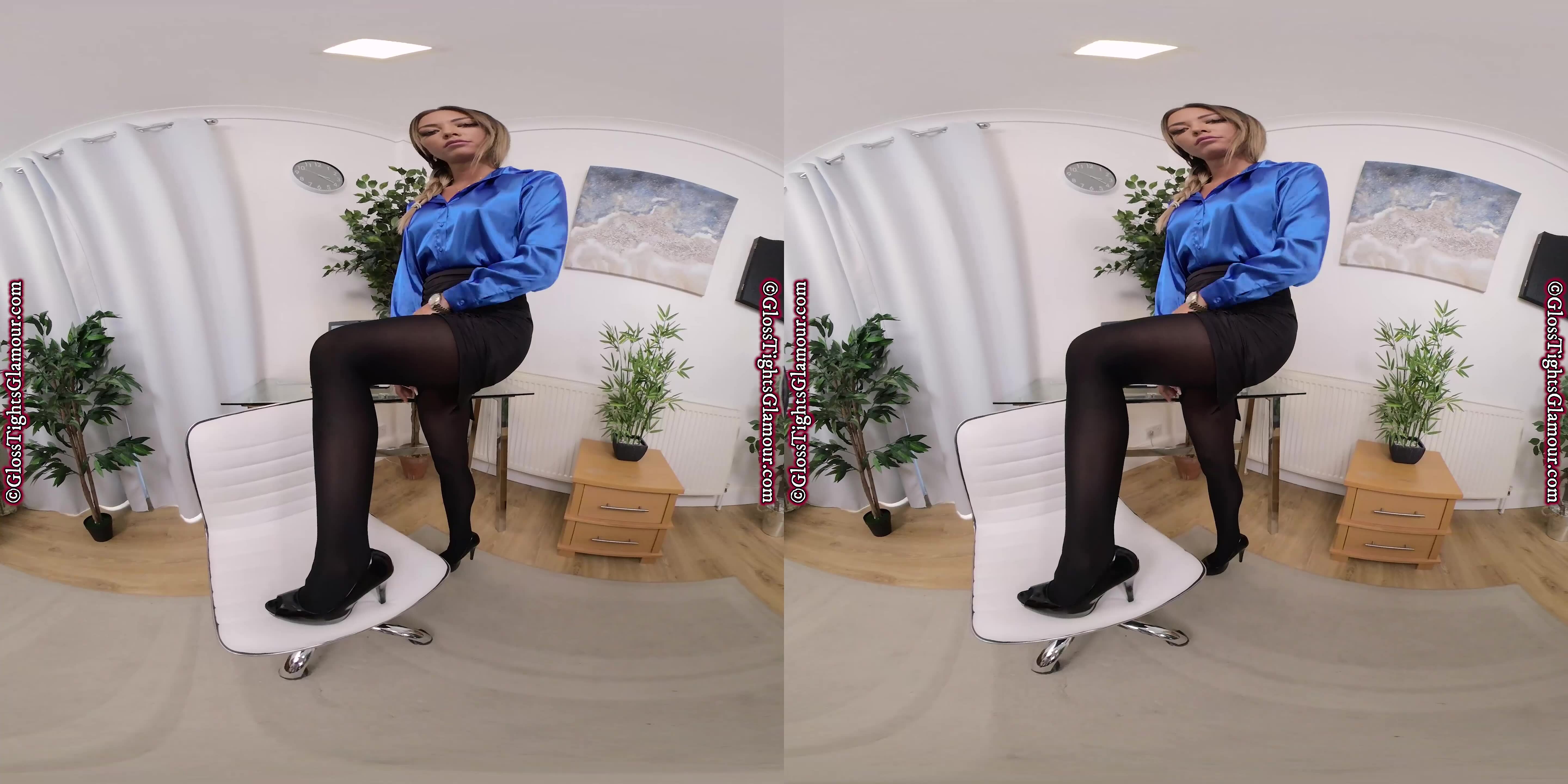 VR Video from shoot with Natalia wearing a silk/satin based secretary outfit comprising; blue silk/satin shirt/blouse (sans bra), black skirt (sans briefs/panties), black glossy tights/pantyhose, and black open-toed high-heeled shoes that are removed to show off toes/feet, in a sensational tease to topless, that allows close up inspection of her glorious legwear – and much more besides, with plenty of vocal encouragement & instructions to help you show your appreciation!