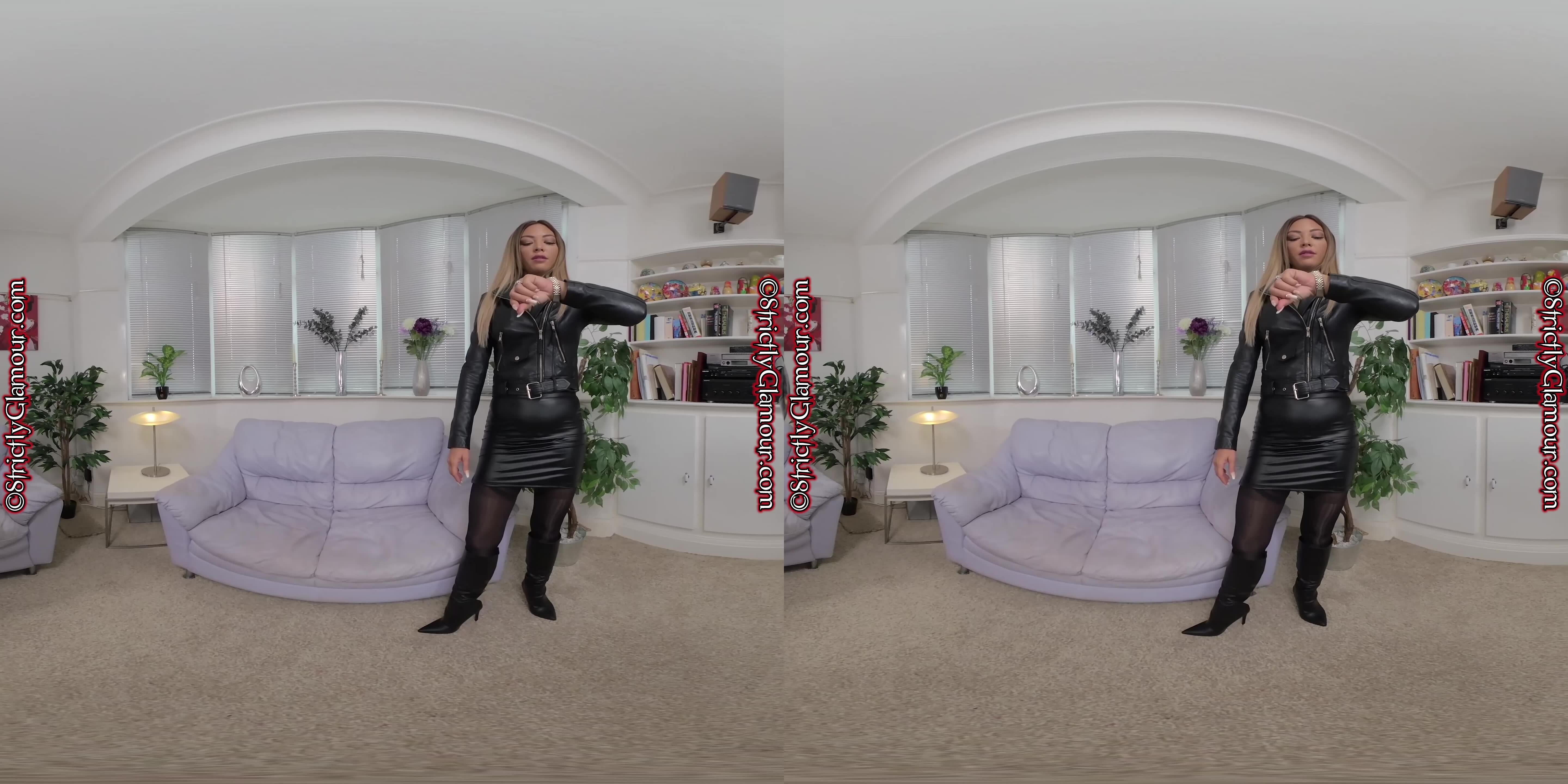 VR Video with mistress Natalia wearing a black leather biker combo comprising; bomber jacket, olive green skin-tight PU wet-look top (sans bra), skin-tight skirt, zipper briefs/panties, black holdup stocking with lace tops, and black knee-high boots, in a tease to naughty nude, with plenty of vocal commentary…
