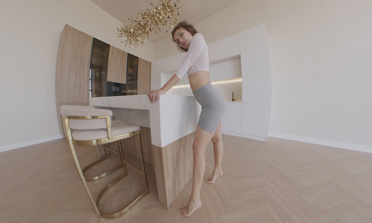 This gorgeous model looks like a girl next door. She has brunette, curly hair, and a cute smile on her face. To spice it all up, the temptress puts nerdy glasses on, ready to seduce you in VR. The unforgettable striptease show takes place in a well-lit apartment that quickly becomes the vixen’s stage. Her white top barely hides her small but perky breasts, and her gray skirt puts the accent on her divine beauty. Feeling the urge to tease, the brunette lets her skirt hit the floor. Little by little, the curly goddess lets you see all of her divine curves.
